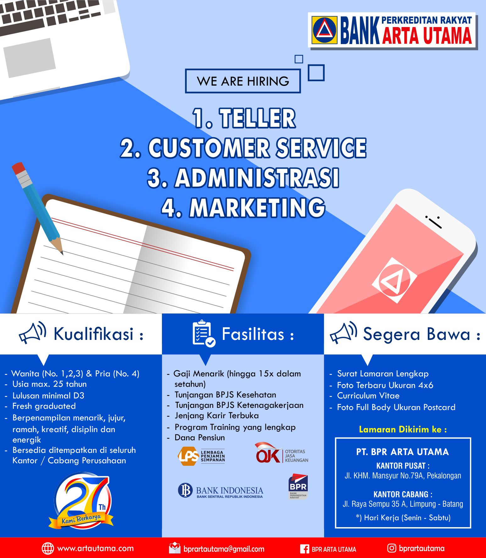 Penempatan : Semua Kantor BPR Arta Utama  ||  Open Tanggal : 13 November 2018   ||   Tutup Tanggal : 15 November 2018